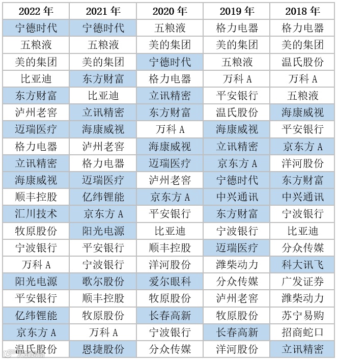 数据来源:Wind;数据截止日期:各年年末;蓝底代表成长股;白底代表蓝筹股。上述个股仅作列举之用,不代表本公司管理的基金的投资标的。个股历史走势并不代表未来业绩。