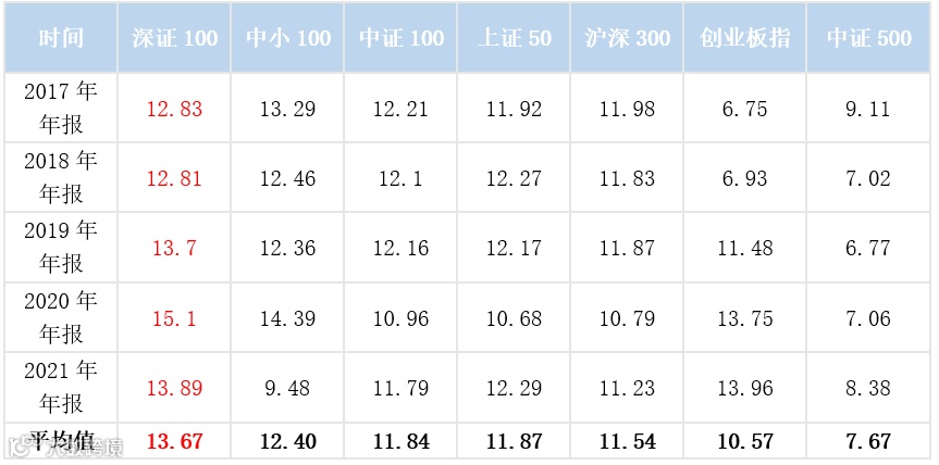 对比七大指数过去5年的ROE(净资产收益率),深证100指数在三个年份位列第一,两个年份位列第二,平均值最高。