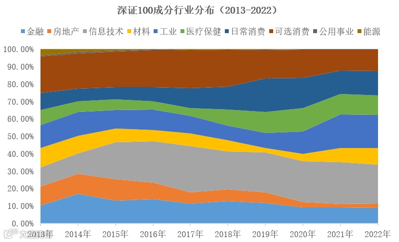 纵览近十年深证100成分行业分布的变化,可以看到深证100在消费、科技、制造、金融等大类板块的分布一直较为平均。板块之间权重的变化也和中国经济近些年的发展同向同行。