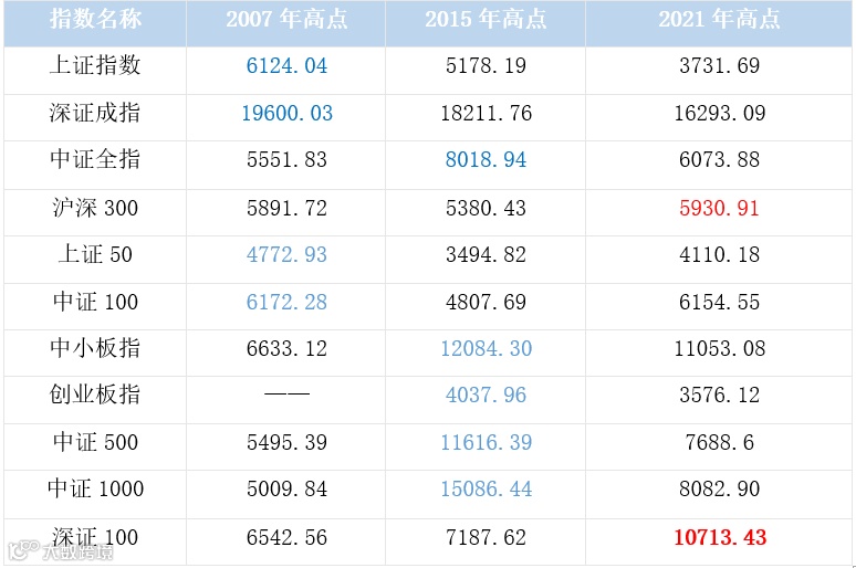 A股主要指数历史高点