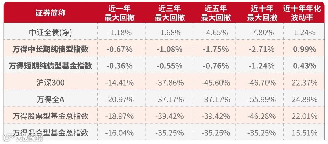 其中,中长期纯债基金指数近一年最大回撤仅0.67%,近三年最大回撤仅1.08%。