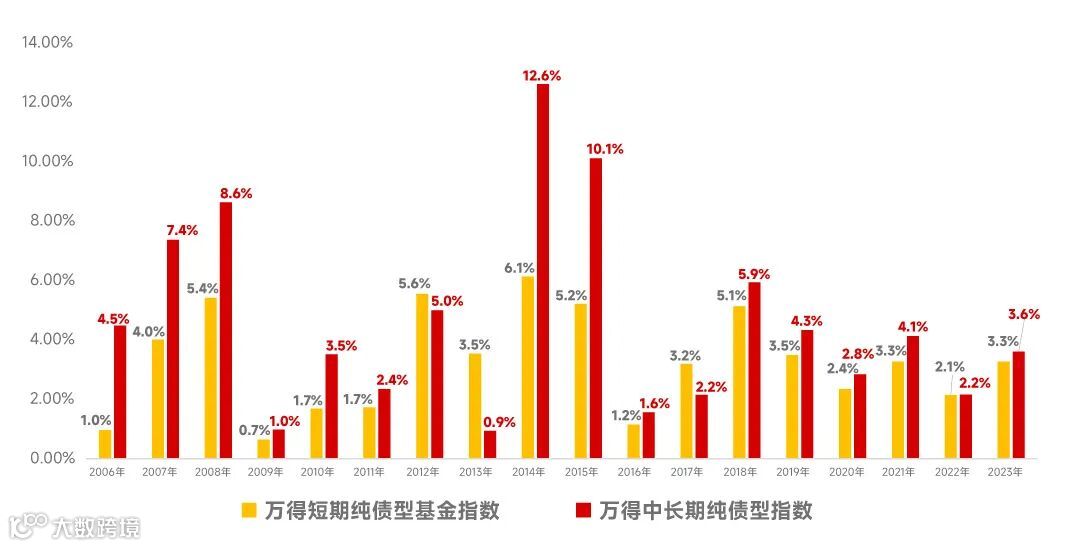Wind数据显示,2006年-2023年18个完成年度里,万得中长期纯债基金指数、短期纯债基金指数年年正收益。