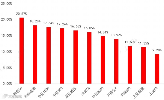 同期A股主要宽基指数几近全部上涨,沪深300、创业板指、万得全指(代表A股整体表现)也分别上涨了11.68%、18.2%、13.92%。