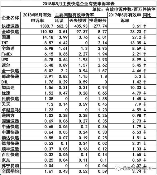 2018年5月,消费者对43家快递企业进行了有效申诉,全国快递服务有效申诉率为百万分之1.61,环比减少0.53,同比减少2.13,高于全国平均有效申诉率的快递企业有13家。全国快递服务快件投递服务的有效申诉率为百万分之0.59,同比减少1.00;快件丢失损毁的有效申诉率为百万分之0.52,同比减少0.68;快件延误的有效申诉率为百万分之0.43,同比减少0.32。