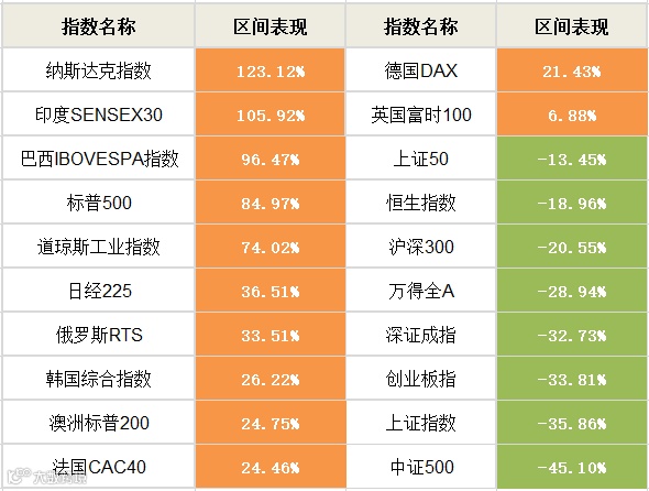 同期美股三大股指均涨超70%,其中纳斯达克指数涨达123%;