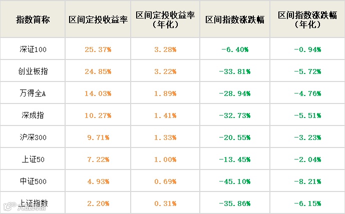 其中,深证100指数、创业板指数的定投收益率超20%(年化收益率超过3.2%),超过了89%(2391只)的股票表现。