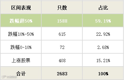 7年来,2015年6月12日之前上市的2683只股票中,2275只下跌,下跌股票占比达85%。这其中,近六成股票跌超50%,惨遭“腰斩”。