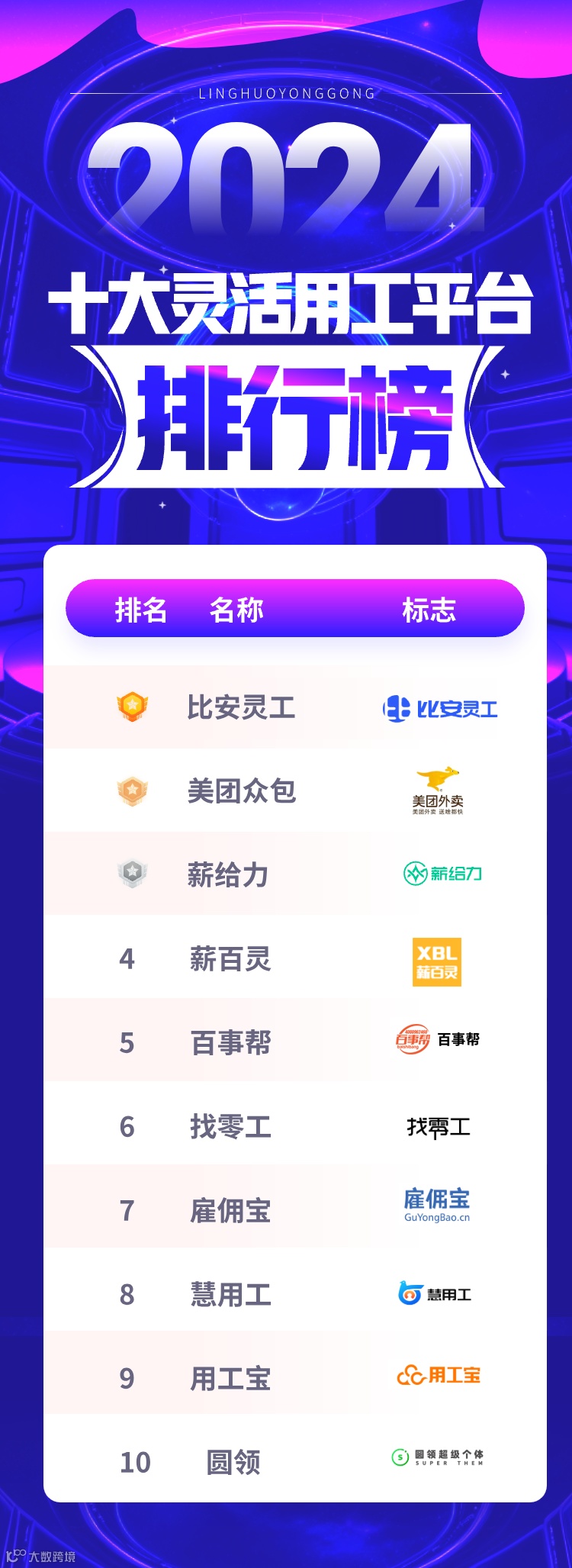 下面是根据各家灵活用工平台规模实力、服务口碑、安全保障等方面对比之后总结的全国灵活用工平台前十名榜单: