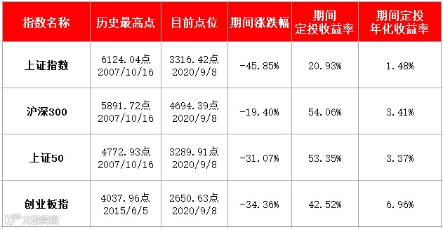 主要指数历史最高点以来定投收益率