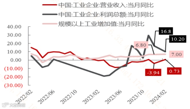 年初以来,经济复苏进程仍在推进,在去金融化的趋势下,经济结构逐步由地产向出口制造业迁移,经济恢复的重点或更多在于量的恢复而非价格,因此工业企业利润率难以出现大幅扩张从而带来增长弹性。2024年初,工业企业经营数据显示边际变化上营收增长>利润总额增长。
