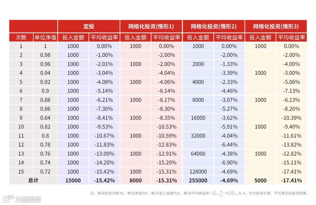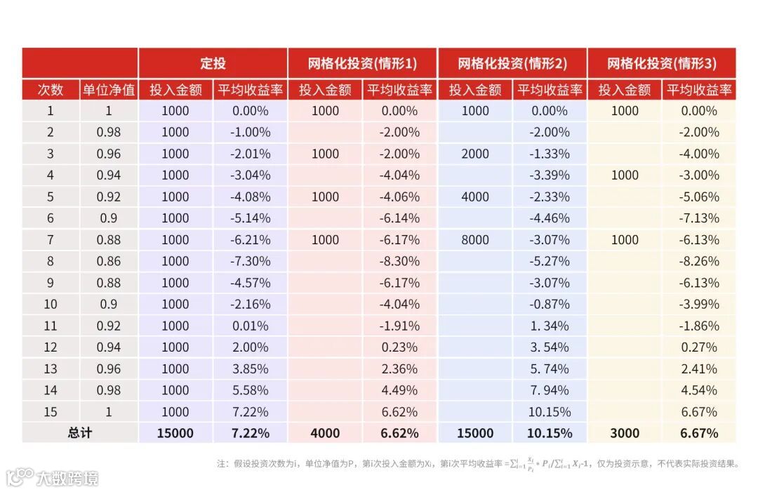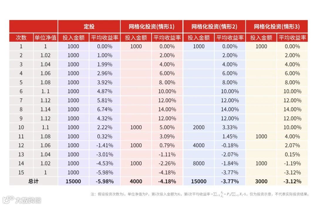 网格化投资是一种利用市场价格波动来获取收益的投资策略,既不定期也不定额,而是围绕基准价,每当价格下跌时,在触发点位执行买入操作,跌的多时可以加倍买入;每当上升时,在触发点位执行卖出操作,涨的多时可以加倍卖出。