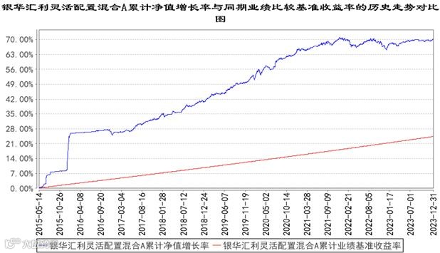 银华汇利灵活配置混合A于2015年5月14日成立,2019年、2020年、2021年、2022年、2023年、自基金合同生效起至今的净值增长率依次为7.81%、8.10%、4.14%、-2.57%、2.22%、70.20%,同期业绩比较基准收益率依次为2.53%、2.54%、2.53%、2.53%、2.53%、24.38%。