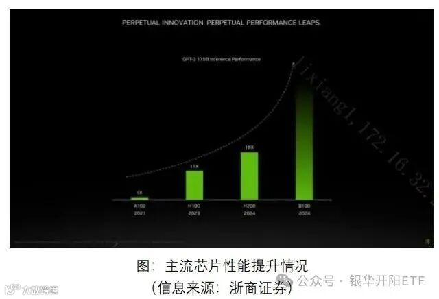 而GPU的发明者,也是本轮AI浪潮中全球受益较大的算力芯片巨头,有望在本届GTC大会上发布最新的B100产品。A100、H100、B100,这些都是AI芯片的称号,作用原理和参数细节不做过多展开,我们只需要记住“一代更比一代强”。每一次AI芯片完成性能突破,都能对应使大模型训练参数量提升,进而提升大模型性能,向“通用人工智能”的终局就更近一步。这也是AI产业“硬件为王”的底层逻辑。