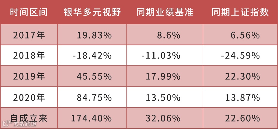 银华多元视野灵活配置成立于2016年05月19日,2017年、2018年、2019年、2020年、自基金合同生效起至今的净值增长率依次为19.83%、-18.42%、45.55%、84.75%、174.40%。同期业绩比较基准收益率依次为8.60%、-11.03%、17.99%、13.50%、32.06%。