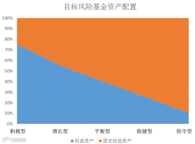 养老目标风险基金会标明风险为“稳健”“平衡”和“激进”,基金名称中往往会明确风险类型。目标风险基金通过控制权益资产比例等方式,将风险控制在一定范围内。如,以“平衡”为风险收益目标,权益类资产配置比例上限在60%左右;以“稳健”为风险收益目标,权益类资产配 30%左右。目前我国目标风险基金大多属于平衡、稳健型。
