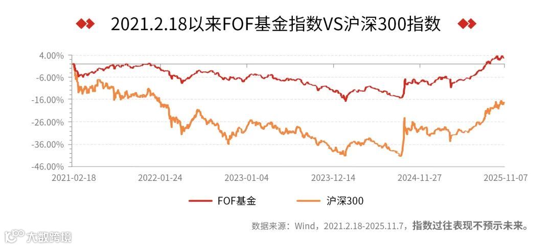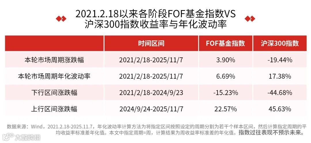 FOF基金对行情的适配性并非短期偶然,而是经过了完整市场周期的验证。截至目前,FOF基金已走过一轮“先下行后上行”的市场周期,若以“9・23 ”为节点,将FOF基金指数与沪深300的表现进行对比,其优势会格外清晰:在市场下行阶段,FOF基金指数的跌幅显著低于沪深300,有效抵御了下跌风险;即便在上行阶段FOF基金指数的弹性稍弱,但拉长整个周期来看,FOF基金指数的累计涨跌幅仍为正,而沪深300至今仍有近20%的跌幅未能修复。更关键的是,FOF基金指数在整个周期内的年化波动率还不到沪深300的1/2,展现了更优的风险收益比。
