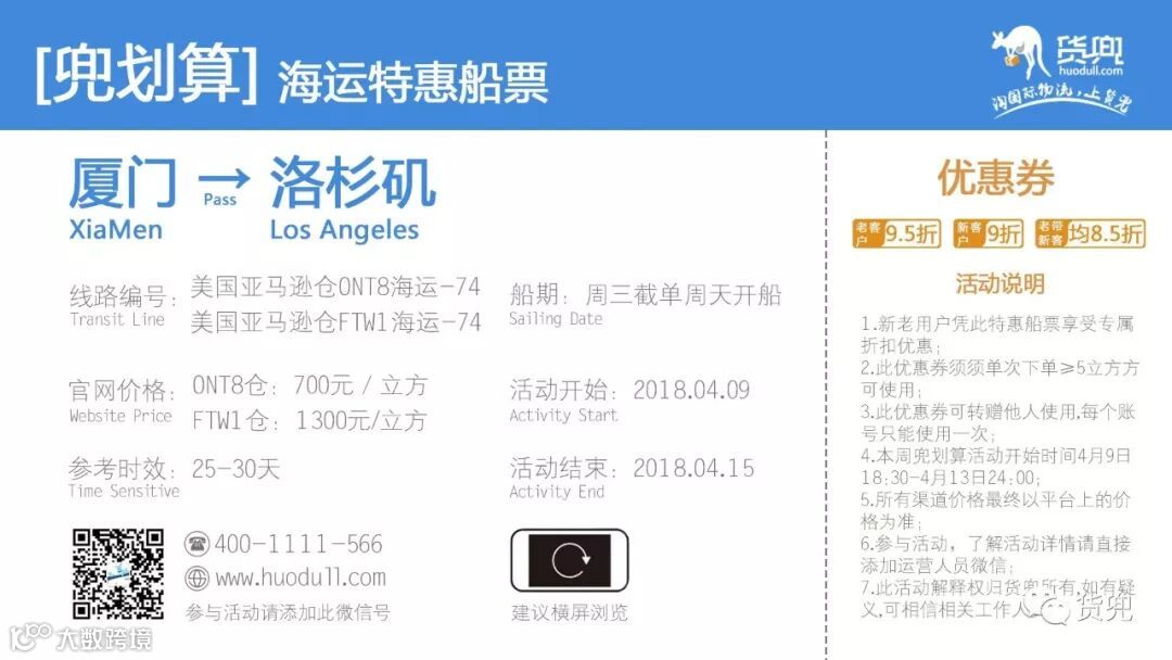 本周【兜划算】针对福建卖家推出美国FBA海运(厦门出货)头程优惠