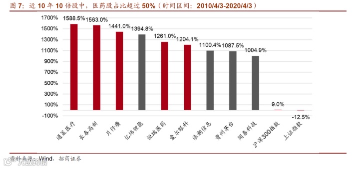 在2010年4月以前上市的公司中,共有9个10倍股,其中5个公司都是医药行业的,占比超过一半。更加值得注意的是,涨幅前6的公司中5家都是医药行业,男神气质可见一斑。