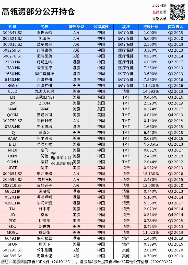 之前我们发过一个高瓴资本的持仓数据: