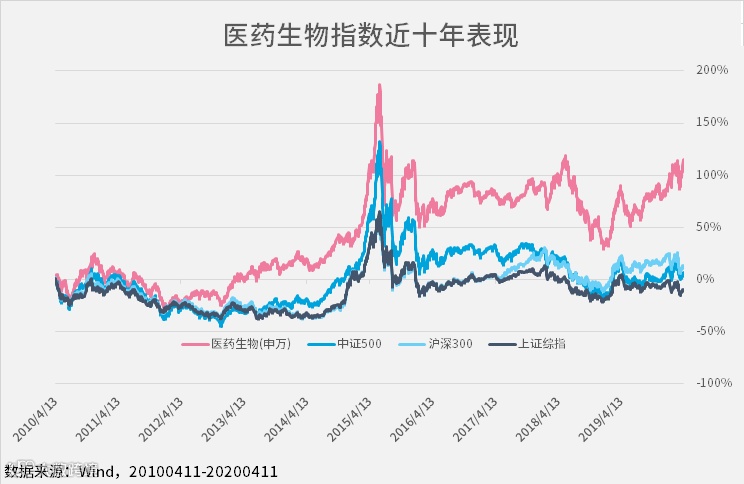 回顾近10年以来的市场,可以看到医药生物行业涨幅达到了112%,同期沪深300指数的涨幅为12.46%,中证500的仅为4.66%,而同期上证指数收益是-10.63%,整体行业收益显著跑赢同期的其他指数。这也充分体现了医药相关主题穿越周期的长期投资特性。