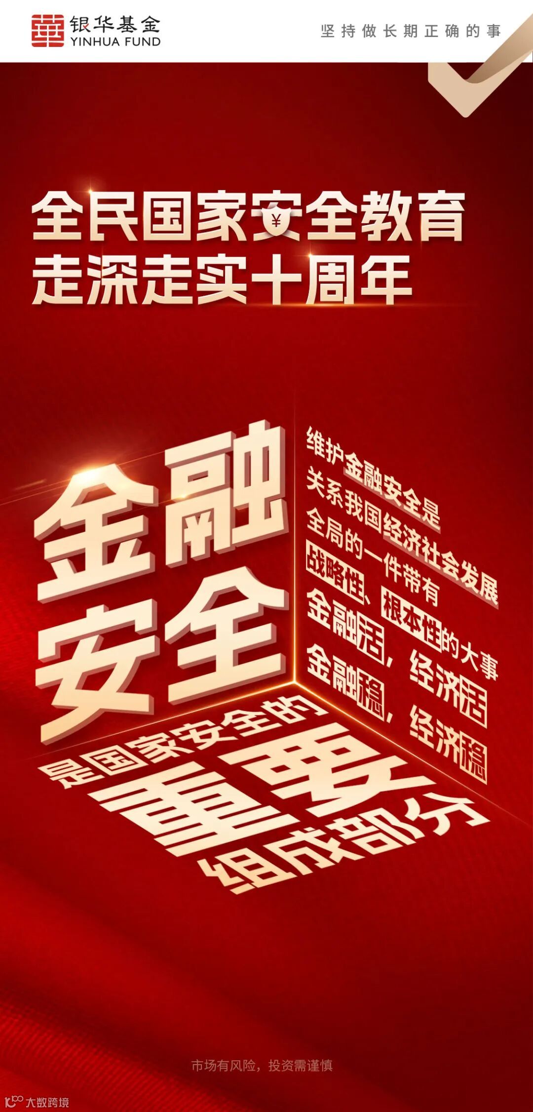 4月15日将迎来第十个全民国家安全教育日,本次活动的主题为“全民国家安全教育,走深走实十周年”。为提升行业国家安全意识和素养,筑牢高质量发展安全屏障,银华基金积极响应基金业协会的号召,诚邀大家参加国家安全教育知识问答活动!