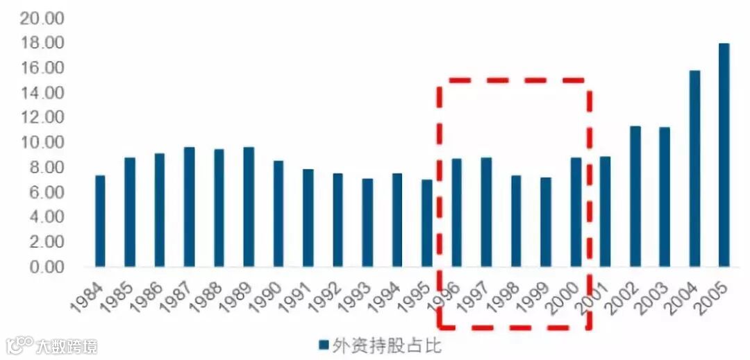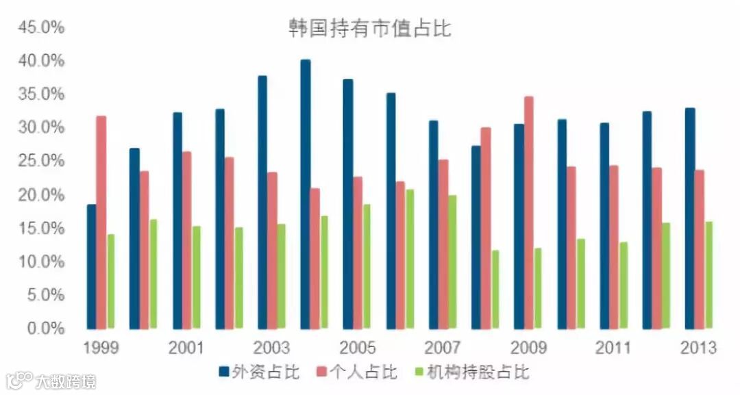 同样的情形也发生在韩国市场,1999年外资持股占比为18.5%,2000年即大幅提升 8.5%至27.0%,外资持股占比在2004年达到最高峰40.1%,此后维持在30%左右的水平。
