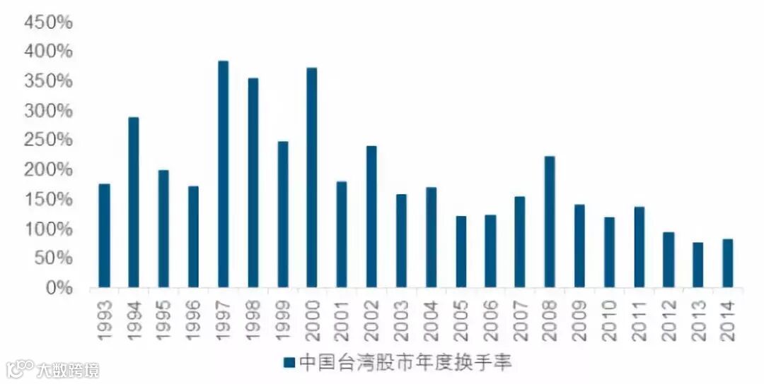 在被纳入MSCI 指数后,台湾股市换手率出现显著下降。1991年至1995年,台湾股市平均年度换手率在240%。2000 年后,股市换手率稳步下降,2014 年换手率仅为81%。
