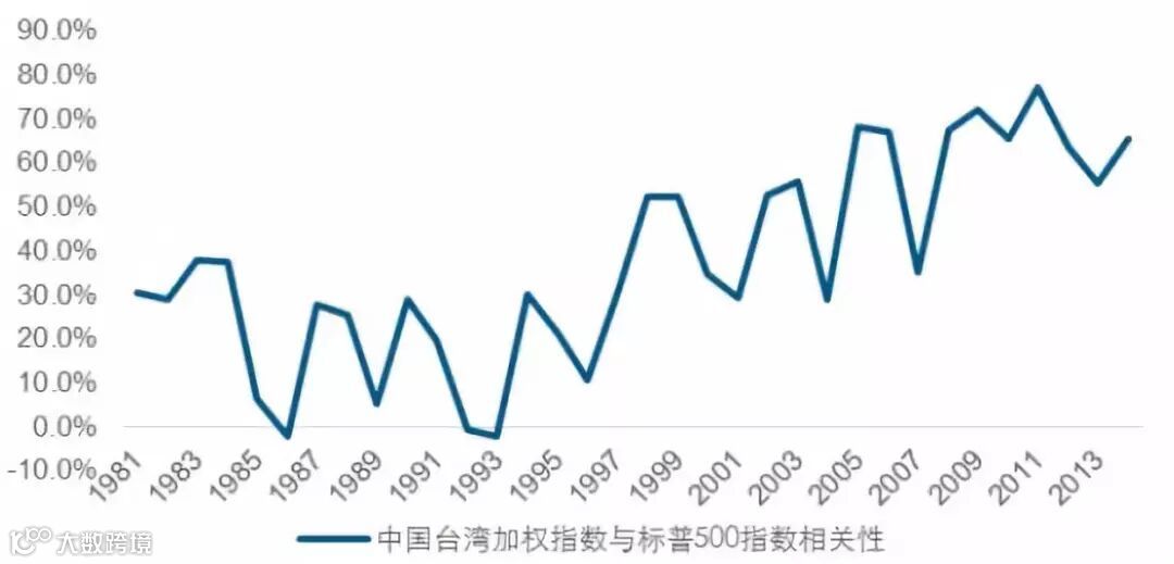 1980年代,中国台湾加权指数与标普500指数的相关性仅为21.9%。1990年代相关性提升到24.3%,2000年代相关性进一步提高至 51.1%,2010 年代,相关性进一步提升至 65.4%。
