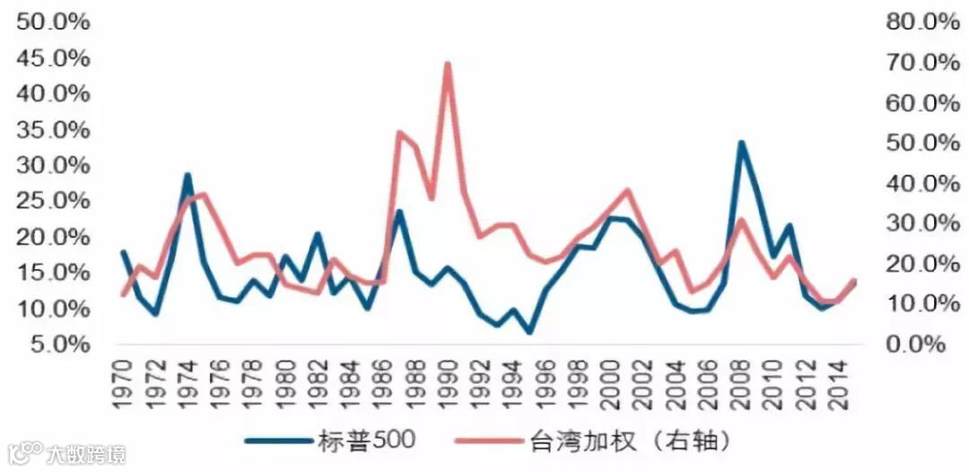 中国台湾股市的波动性显著降低。1986-1990年,中国台湾加权指数年化波动率可以达到50%。而在2000年前五年,年化波动率已经降到25%左右的水平。2015年,台湾股市波动率已降至15.9%的水平。