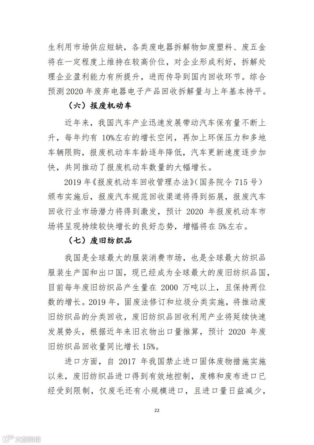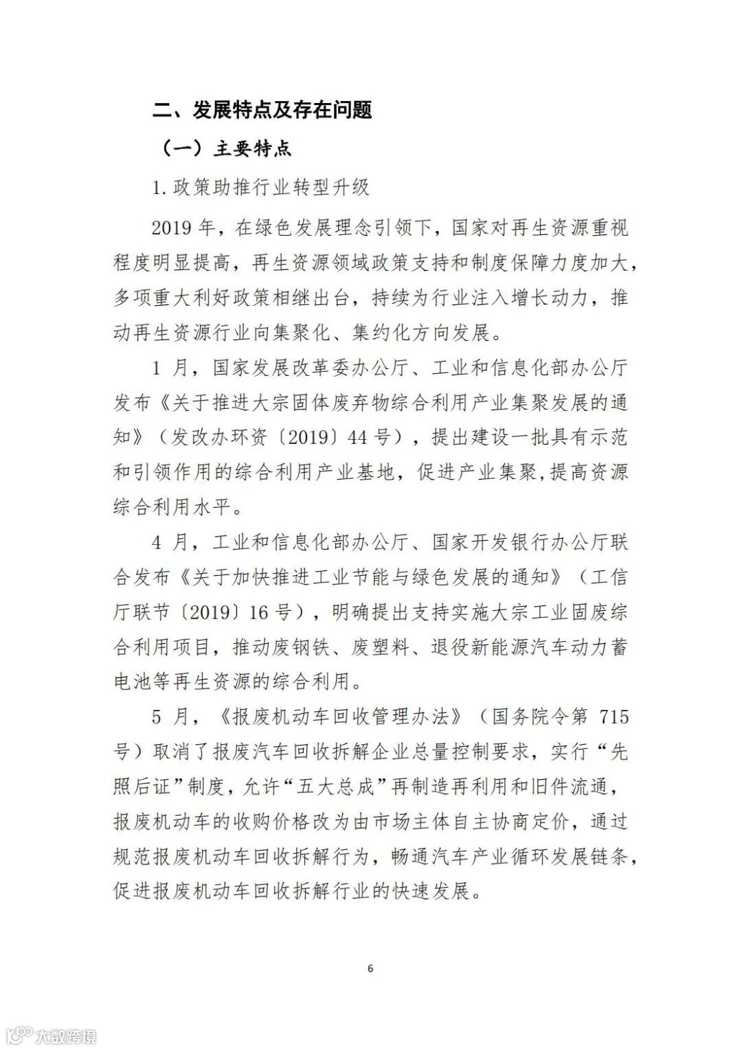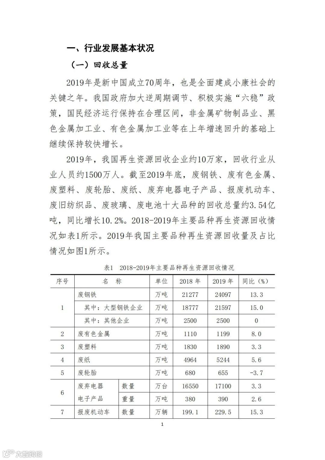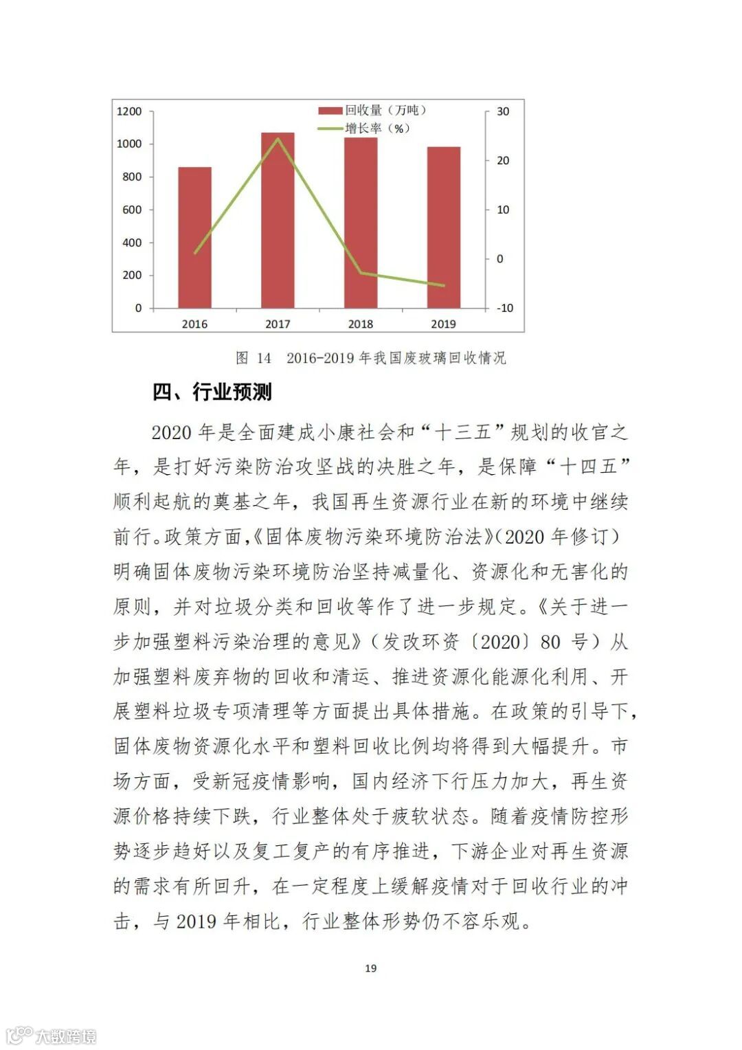 为全面系统地反映 2019 年再生资源回收行业的基本情况,更好地服务企业和社会公众,商务部流通业发展司整合各方资源,组织编写发布《中国再生资源回收行业发展报告(2020)》。报告全方位总结 2019 年度我国再生资源回收产业的发展特点和存在问题,系统梳理相关政策措施,并对未来发展趋势和前景进行了分析与展望。