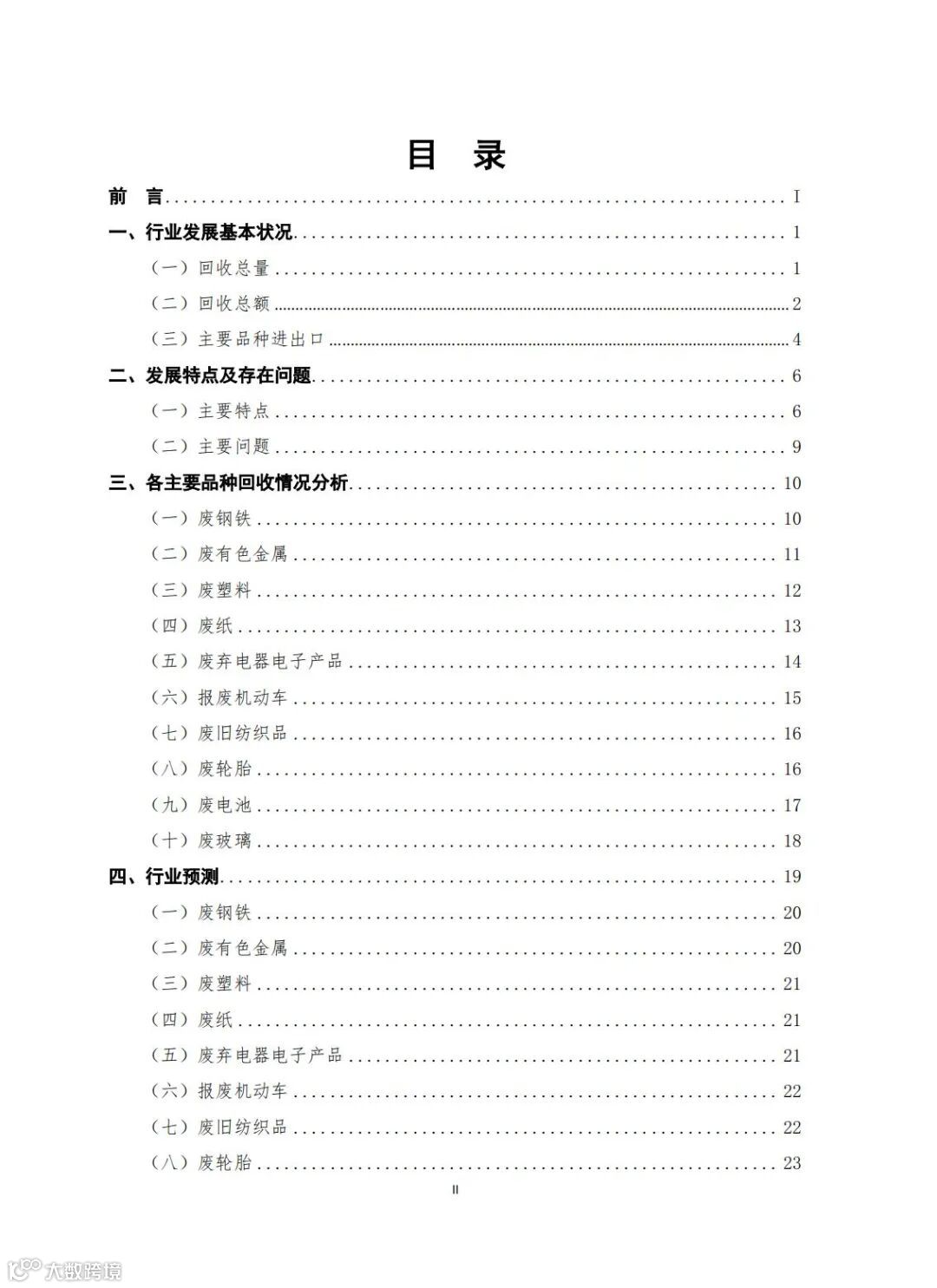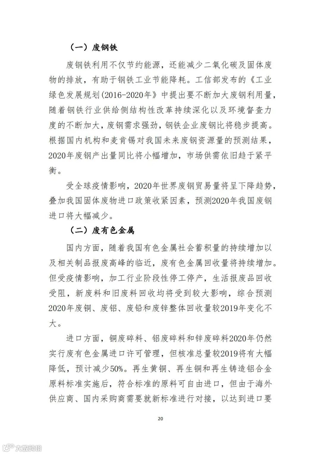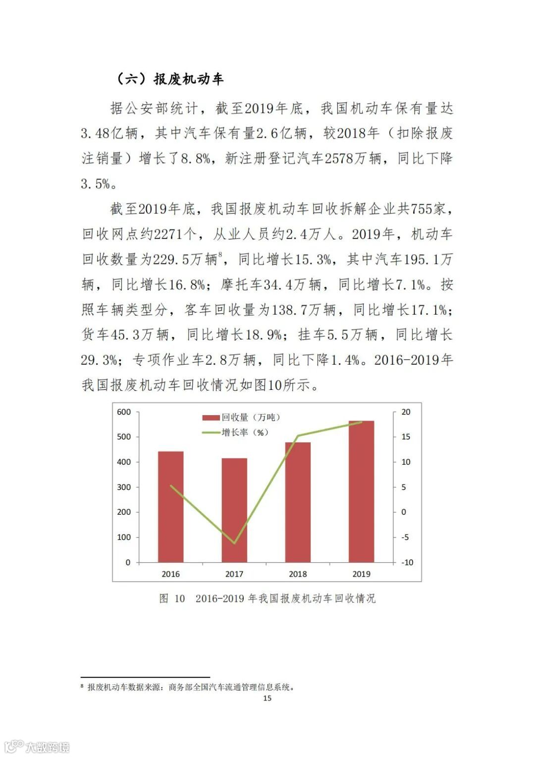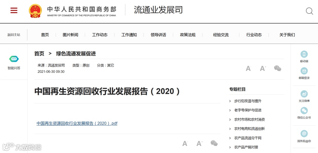 为全面系统地反映 2019 年再生资源回收行业的基本情况,更好地服务企业和社会公众,商务部流通业发展司整合各方资源,组织编写发布《中国再生资源回收行业发展报告(2020)》。报告全方位总结 2019 年度我国再生资源回收产业的发展特点和存在问题,系统梳理相关政策措施,并对未来发展趋势和前景进行了分析与展望。