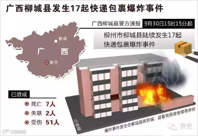 9月30日广西柳城县警方通报,9月30日在柳城县发生的17起包裹爆炸事件已致7人死亡,已排除暴恐案件的可能性,犯罪嫌疑人身份已确定。通报称,9月30日15时15分起,柳州市柳城县陆续发生17起快递包裹爆炸事件。目前已造成7人死亡2人失联,另有51人不同程度受伤。爆炸事件发生在柳城县商贸城、县畜牧局宿舍楼等多处。