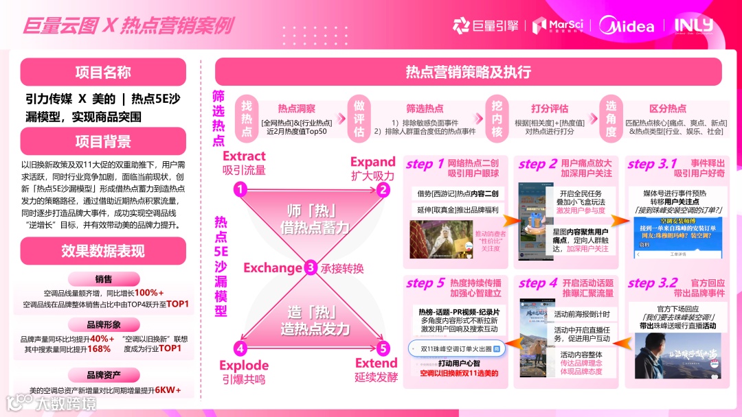 以旧换新政策及双11大促的双重助推下,用户需求被激发,同时面临行业竞争加剧的现状,品牌借助巨量云图洞察,创新「热点5E沙漏模型」形成借热点蓄力到造热点发力的策略路径;通过借势近期热点积累流量,同时逐步打造品牌大事件,成功实现空调品线“逆增长”目标,并有效带动美的品牌力提升。