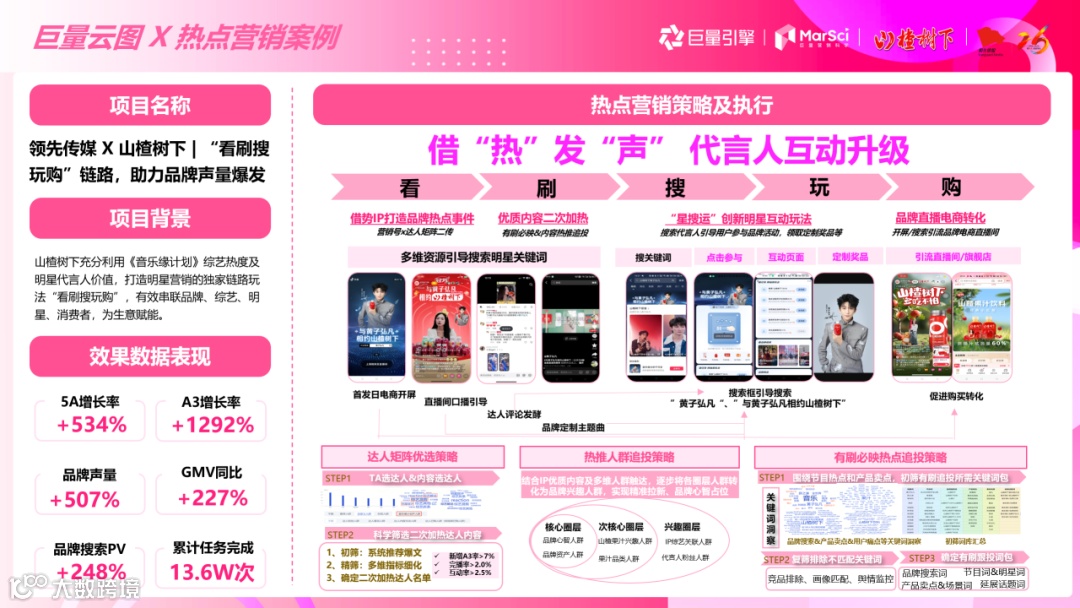 山楂树下借势云图热点营销,充分利用《音乐缘计划》综艺热度及明星代言人价值,配合综艺二传+“星搜运”创新明星互动玩法,打造明星营销的独家链路玩法“看刷搜玩购”,有效串联品牌、综艺、明星、消费者,为生意赋能。
