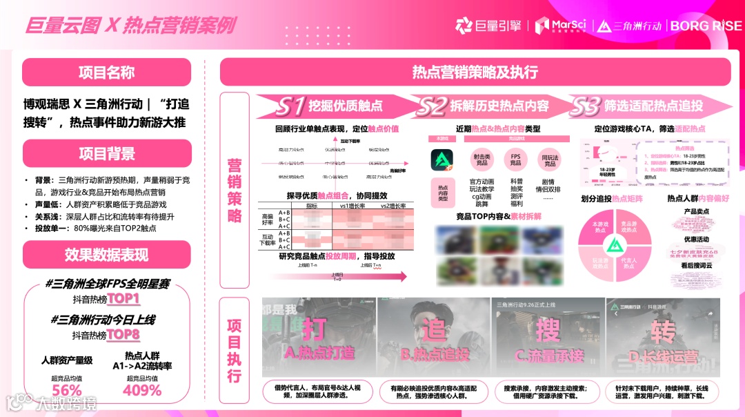 三角洲行动新游上线,声量稍弱于竞品、人群资产积累略低于竞品,深层人群占比和流转率有待提升;同时,游戏行业&竞品有陆续开始布局热点。在这一背景下,博观瑞思协同品牌方,通过精细化执行“打追搜转”热点营销链路以及应用云图热点追投功能,助力新游大推。