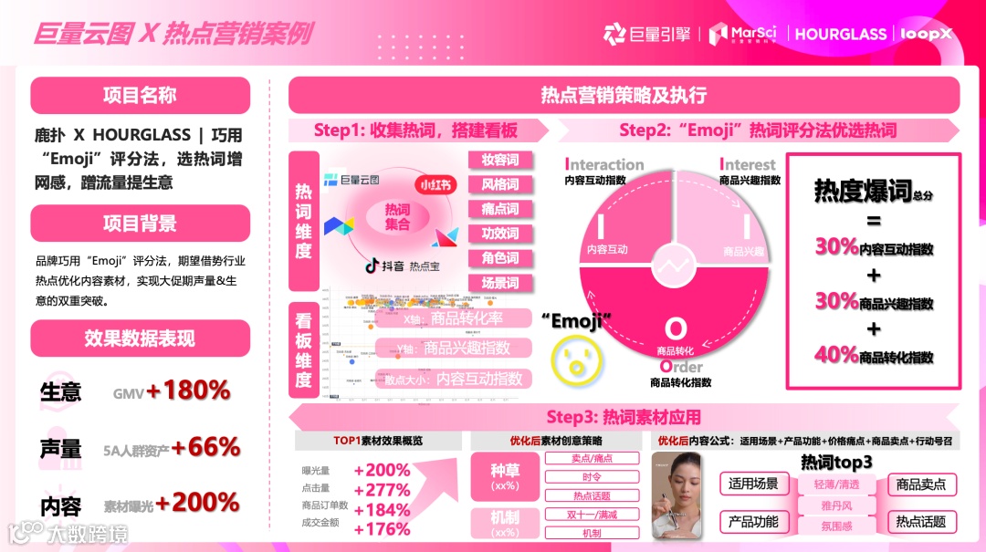 大促周期内,品牌营销预算相对有限,期望能借势行业热点之东风,实现自身内容曝光&生意的双重突破。因此品牌通过巨量云图-自定义报表搭建实时热词看板,创新“Emoji”热词评分法,优选网感热词,拆解行业&竞品的优质热点,调优本品素材话术&创意,助力品牌内容声量&大促生意提升。
