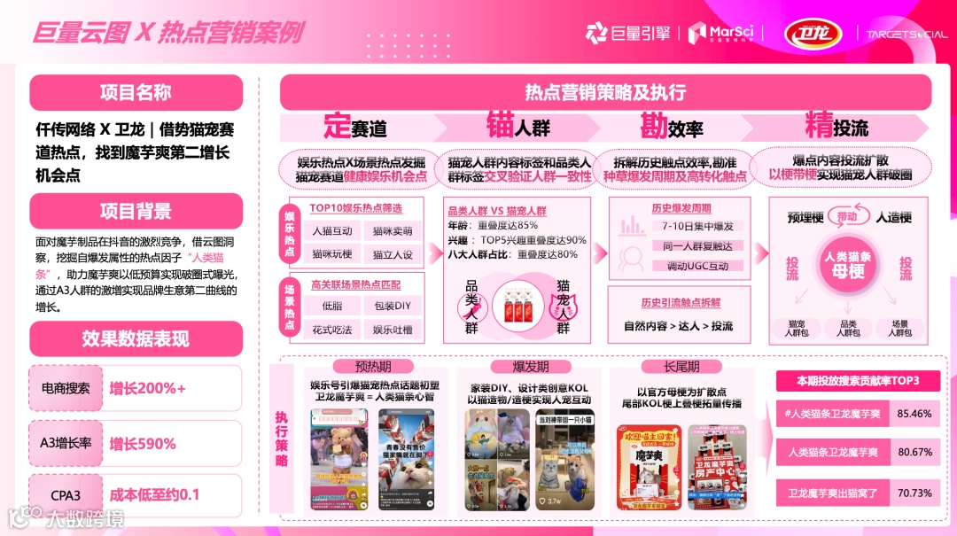 魔芋制品在抖音竞争激烈,这一背景下,品牌借云图洞察,挖掘自爆发属性的热点话题“人类猫条”,并通过内容营销抢占这一心智,自身魔芋爽产品以低预算实现破圈式曝光,A3人群激增带来品牌生意第二曲线的增长。