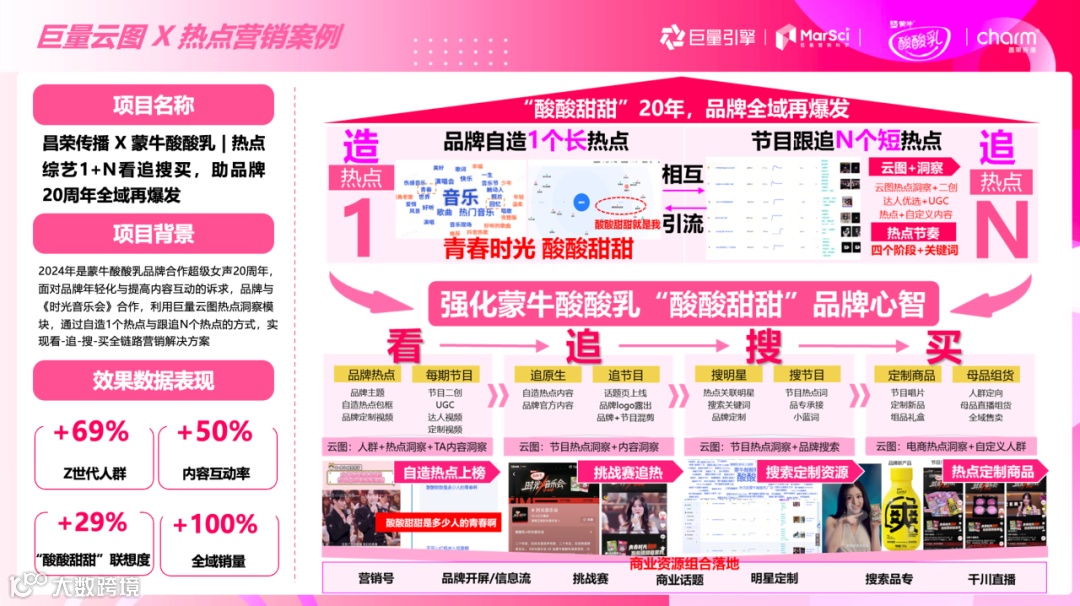 2024年是蒙牛酸酸乳品牌合作超级女声20周年,面对品牌年轻化与提高内容互动的诉求,品牌与《时光音乐会》合作,利用巨量云图热点洞察模块,通过自造1个热点与跟追N个热点的方式,实现看-追-搜-买全链路营销解决方案,强化蒙牛酸酸乳“酸酸甜甜”品牌心智。