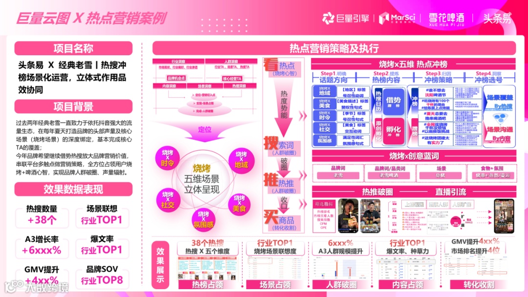 过去两年经典老雪一直致力于依托抖音强大的流量生态,在每年夏天围绕核心场景「烧烤」做深度绑定,打造头部品牌声量;今年品牌继续以「烧烤」场景心智展开,利用巨量云图挖掘「烧烤五维场景」,借势热搜放大品牌营销价值,串联平台多触点做营销策略,全方位占领用户烧烤+啤酒心智,实现品牌人群破圈、声量辐射。