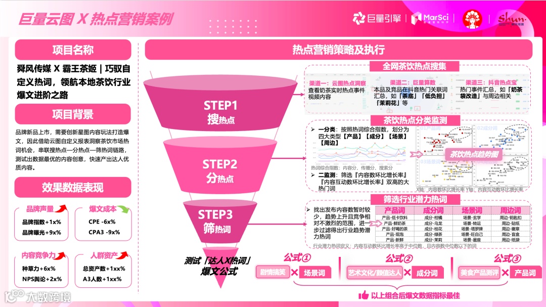 品牌升级&新品孵化&人群破圈场景下,往往会借助娱乐热点、节点营销、明星IP联名等营销策略,有计划的打造属于品牌自身的热点事件,进而获得品牌生意突围;品牌自造热点,核心在于种收协同,前置规划。借助巨量云图热点洞察,巨量引擎多营销产品串联,能够帮助品牌增加“造热点”的确定性。
