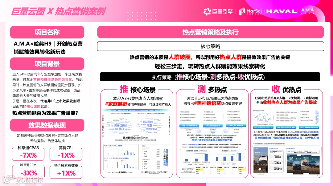 24年以来汽车行业竞争加剧,车企营销预算追求趋向效果化,如何提升效果转化成为了车企营销关注的头等大事;与此同时热点营销的破圈价值初步显现,“热点营销能否助攻效果广告提效”成了众多车企希冀探索的课题。本品牌通过“推核心场景-测多热点-收优热点”的热点营销策略及依据选定热点定制素材、定向热点人群的落地执行方法,成功赋能效果线索转化。