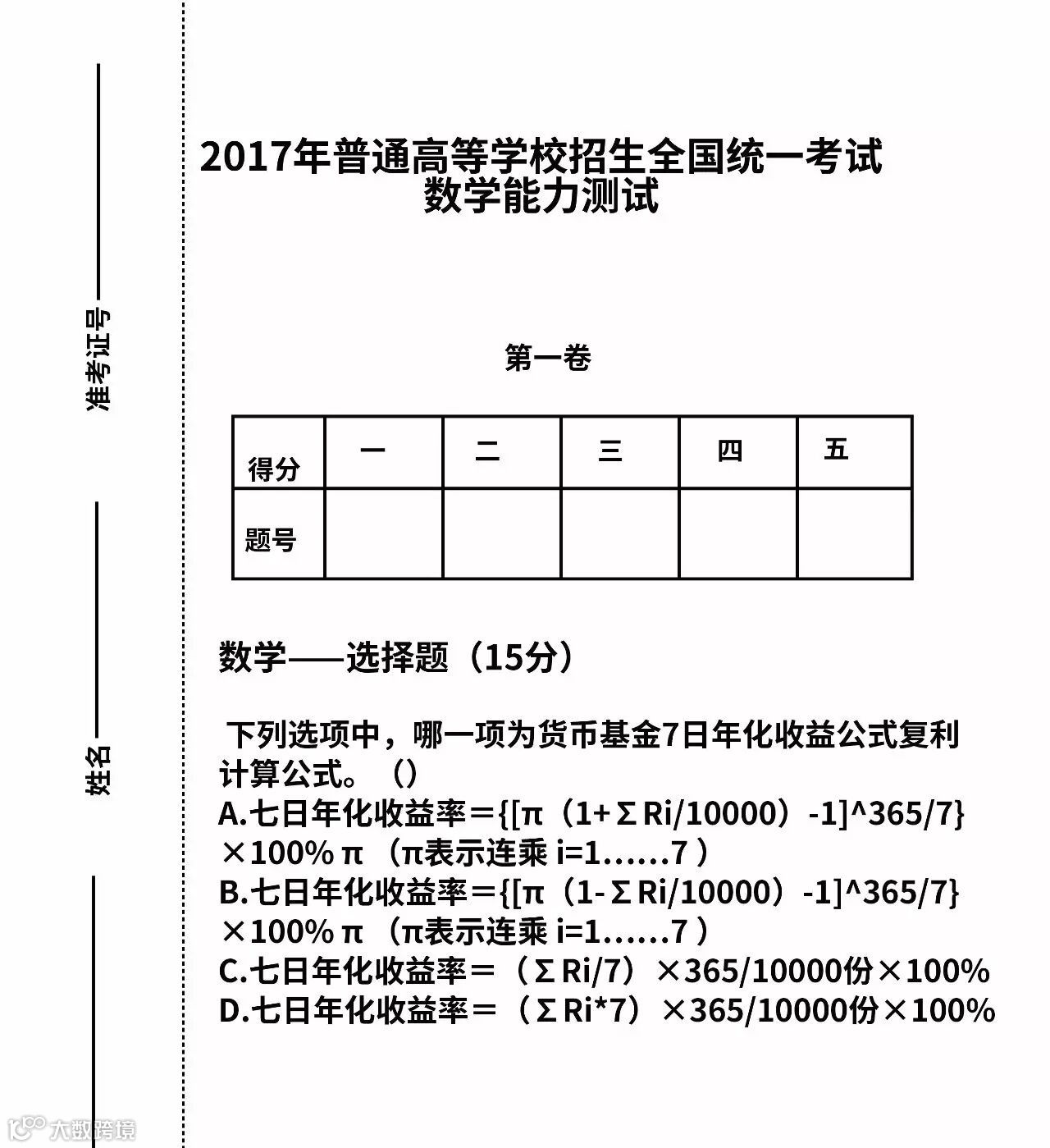 至于7日年化收益率,是货币基金收益表现的指标。上题的正确答案是选择A。话说如果你不是数学天才的话,这道题就交给基金公司的结算部的AlphaGo(计算器)。