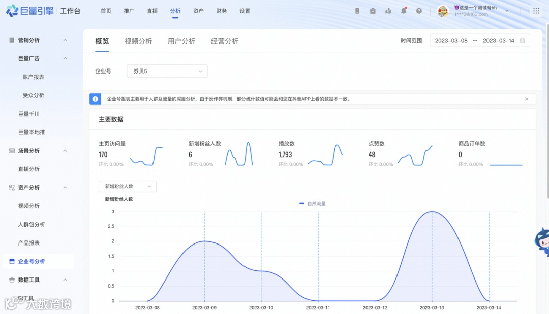 • 【营销分析】可以查看巨量广告、巨量千川、巨量本地推的投放数据(巨量广告还可以查看受众数据),多账户数据可统一查询监控,便于用户根据转化和消耗情况及时修改计划预算。