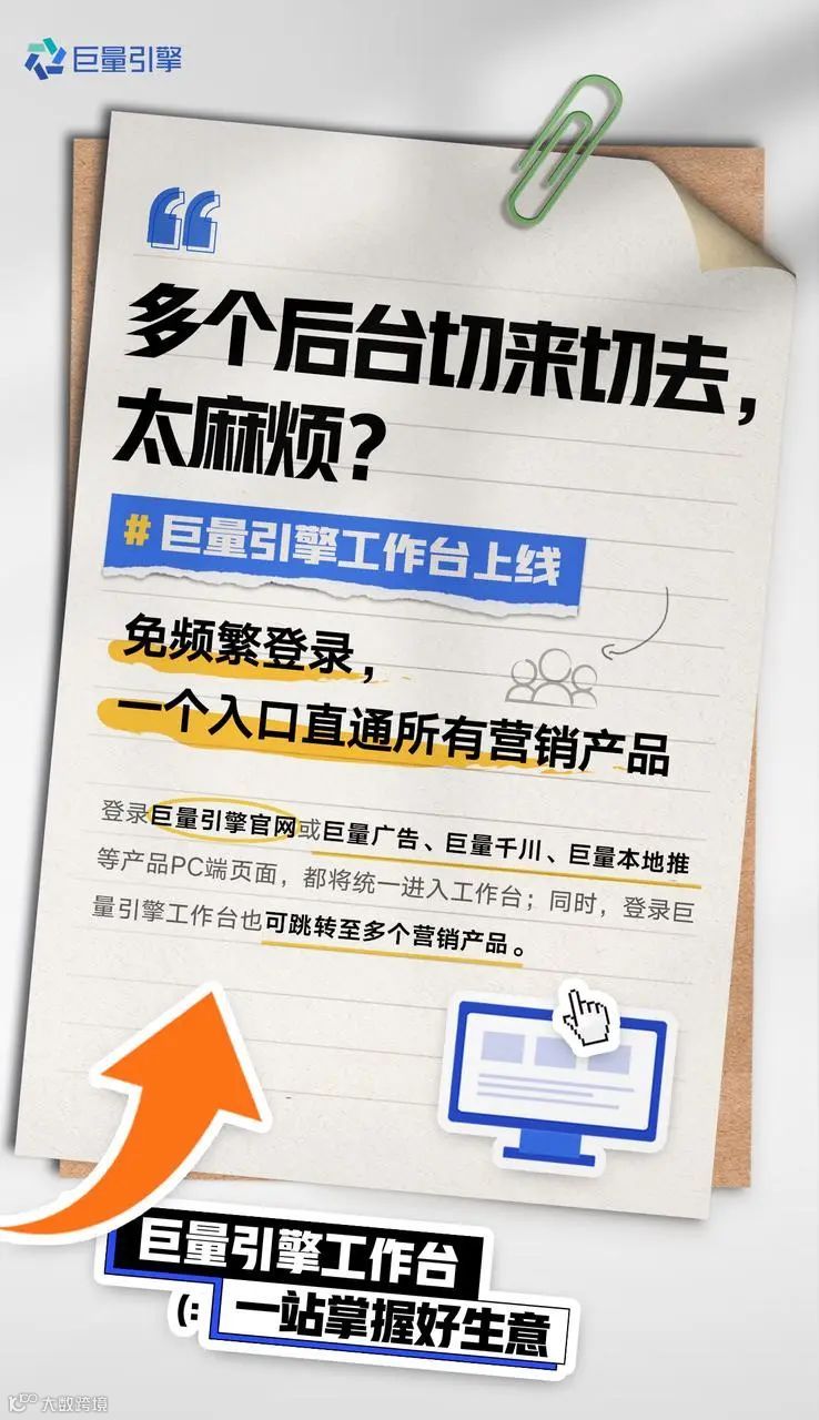 首先,登录访问更便捷。多个产品统一了登录页面风格,用一个账号即可访问巨量广告、巨量千川和巨量本地推等不同平台。品牌主登录后将统一进入工作台页面,通过工作台可直接跳转到各个不同的营销产品。