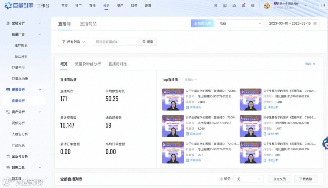 • 【资产分析】可对视频、人群包、产品报表进行分析,反哺投放。
