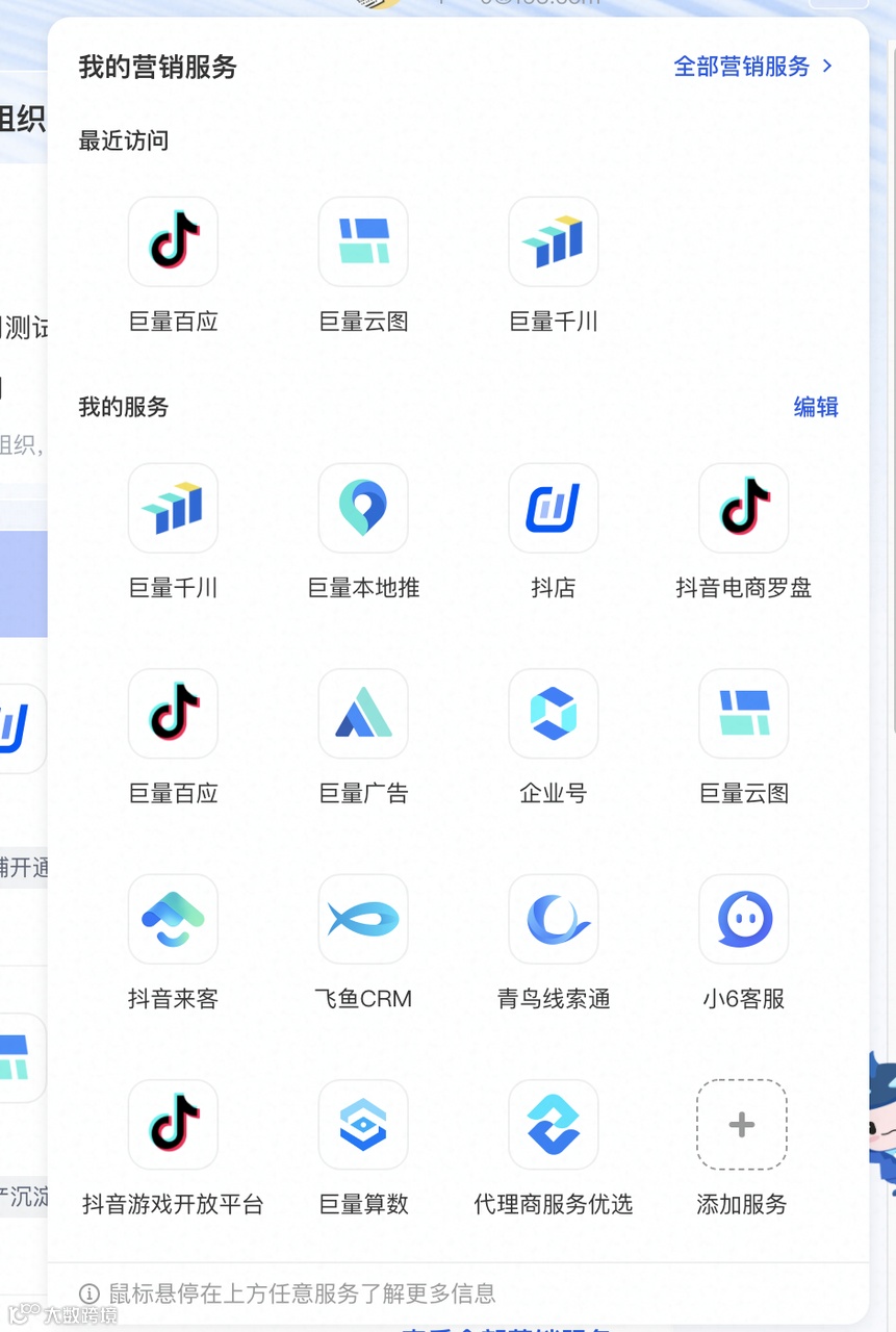 此外,巨量引擎工作台还提供个性化服务,品牌主可以在首页右上角【我的营销服务】里,根据需求灵活编辑和添加常用营销产品,实现便捷访问。