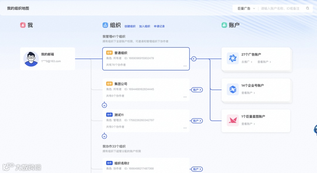 用户可以在巨量引擎工作台中通过【组织地图】,看到自己所管理、协作的所有账户,架构清晰、一目了然。