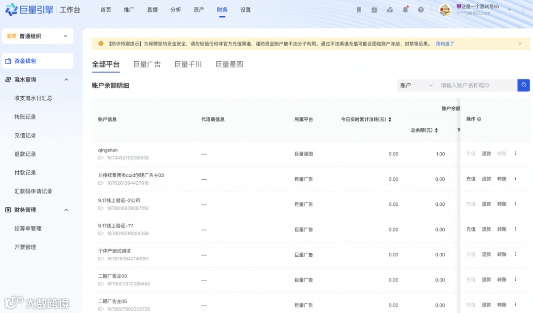 • 在资金管理方面,巨量引擎工作台支持跨平台账户资金一键查询,包括各个账户的收支流水、转账记录、充值记录、退款记录、付款记录等。如需账单和发票,也可自助申请,便捷又高效。