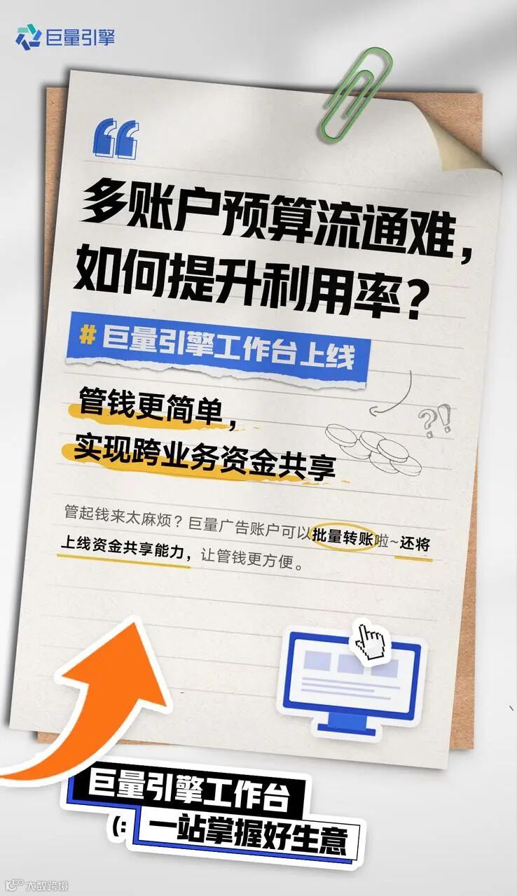 为了解决生意场景多元化带来的协同难题,巨量引擎工作台则连通多平台,完善账户、资金、资产等方面的统一管理能力,助力品牌主提升协作效率。