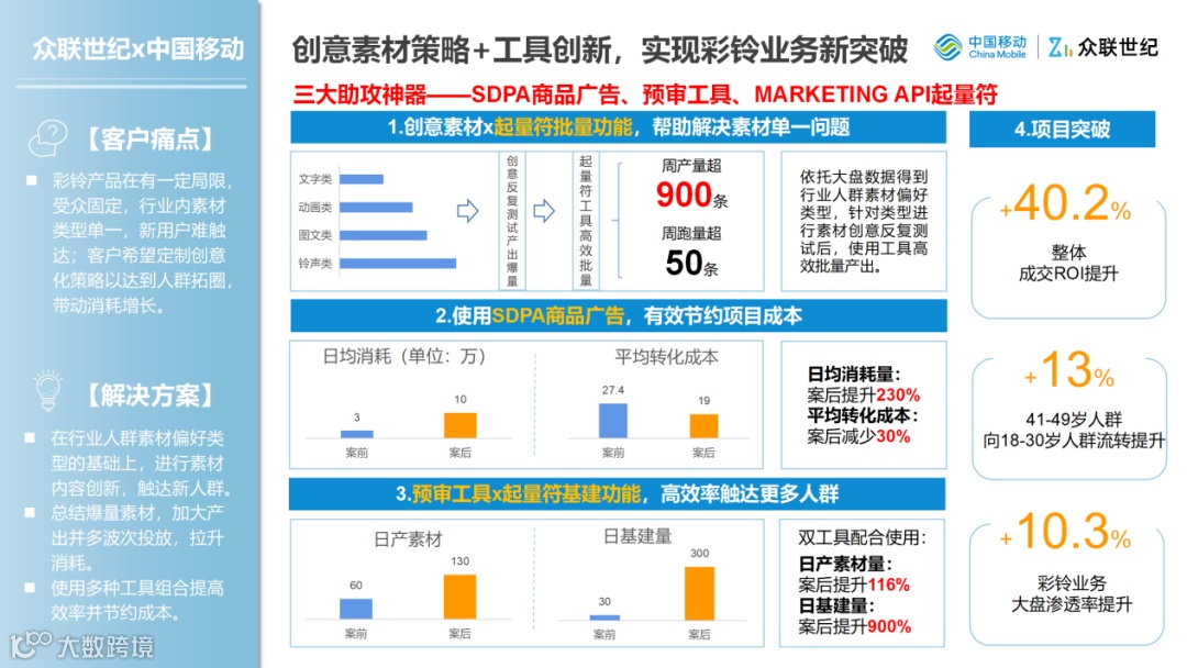 移动彩铃过去的素材普遍存在着一个通病,投放素材量大但类型单一,跑量素材产出困难。于是,众联世纪在诊断分析后,从素材和工具两方面为移动彩铃提出了核心解决策略。